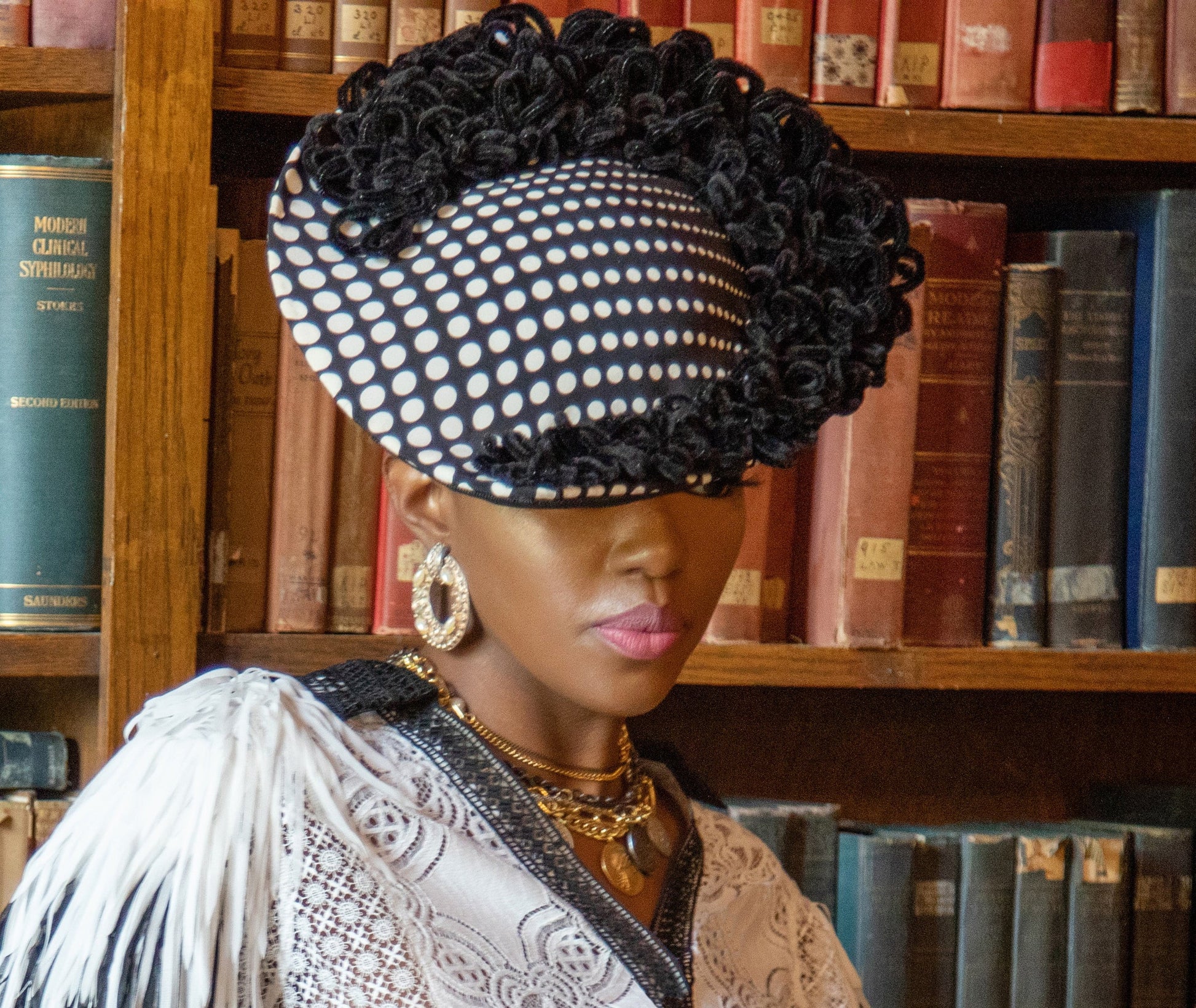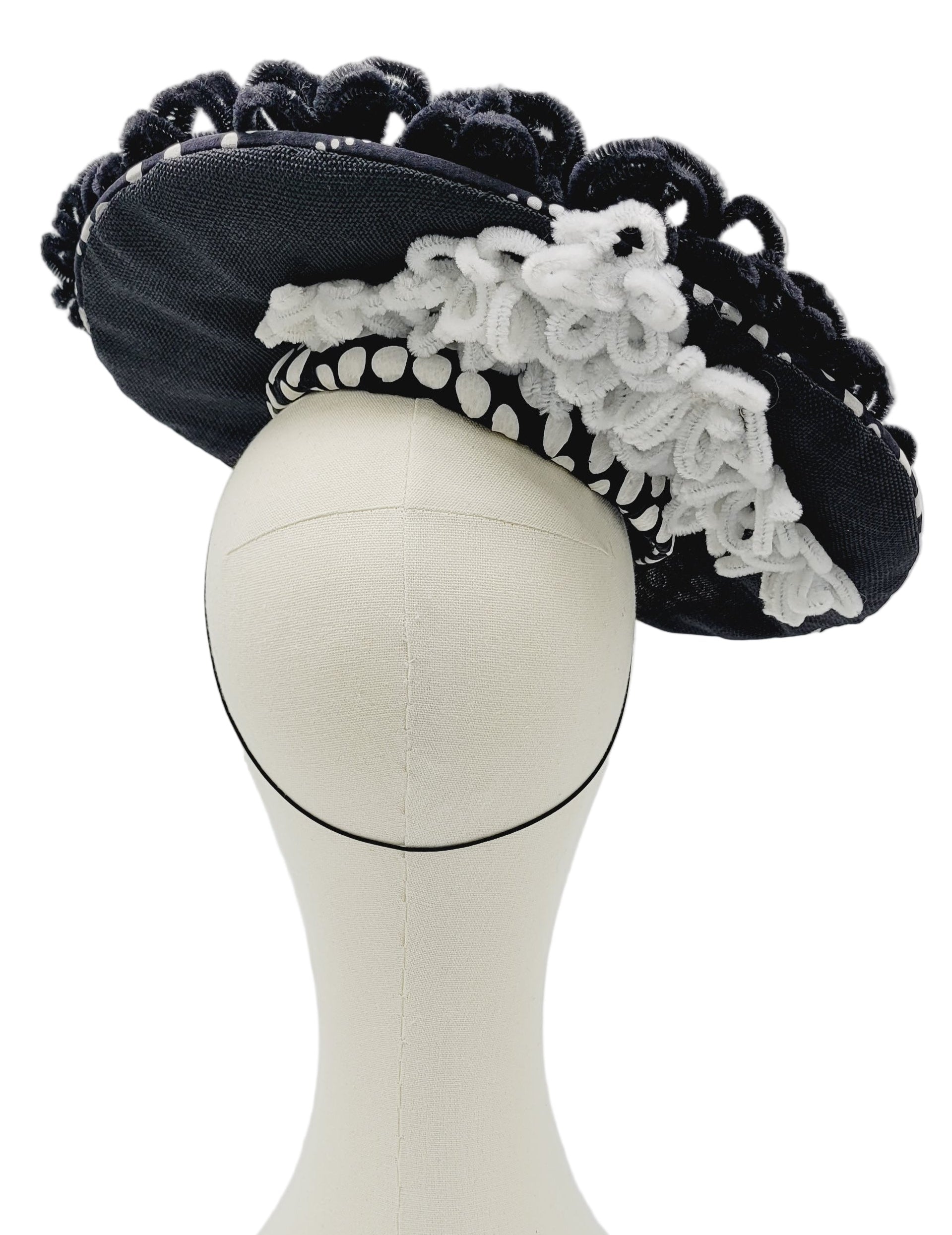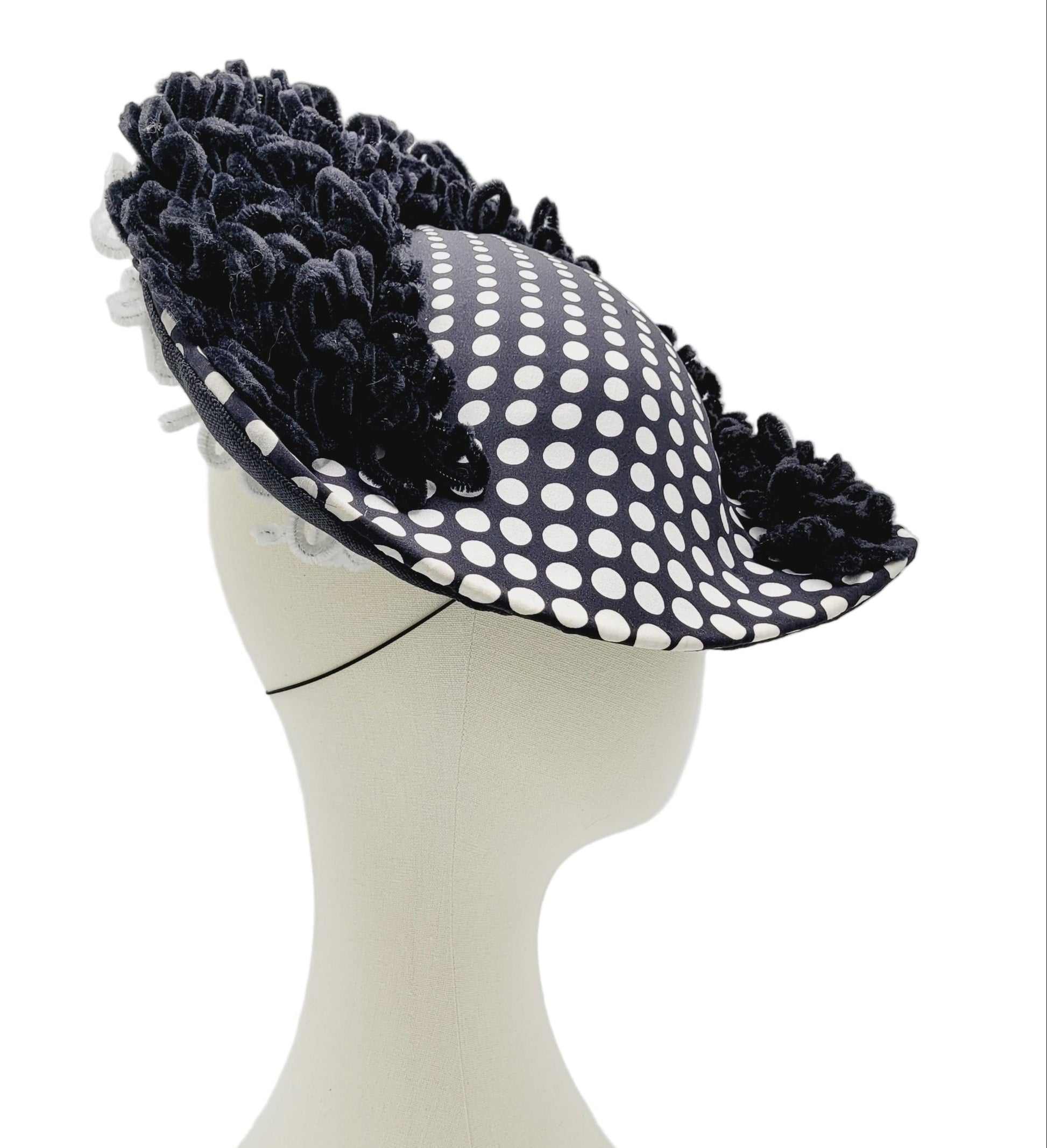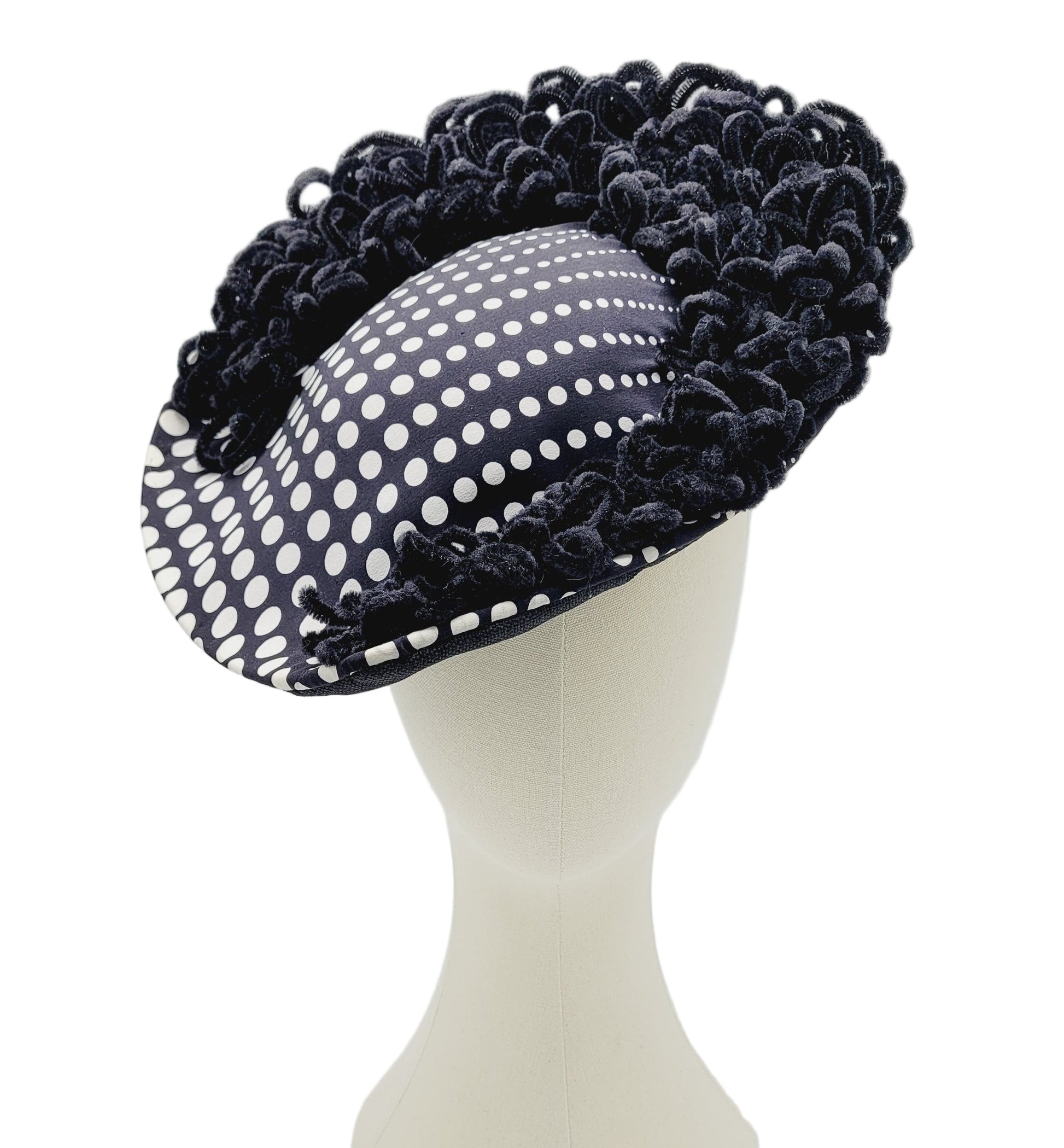 Black and White Polk-a-Dot Fascinator with Sculpted Pipe Cleaners and Elastic Head Band. Hand Crafted in Bronx, NY.