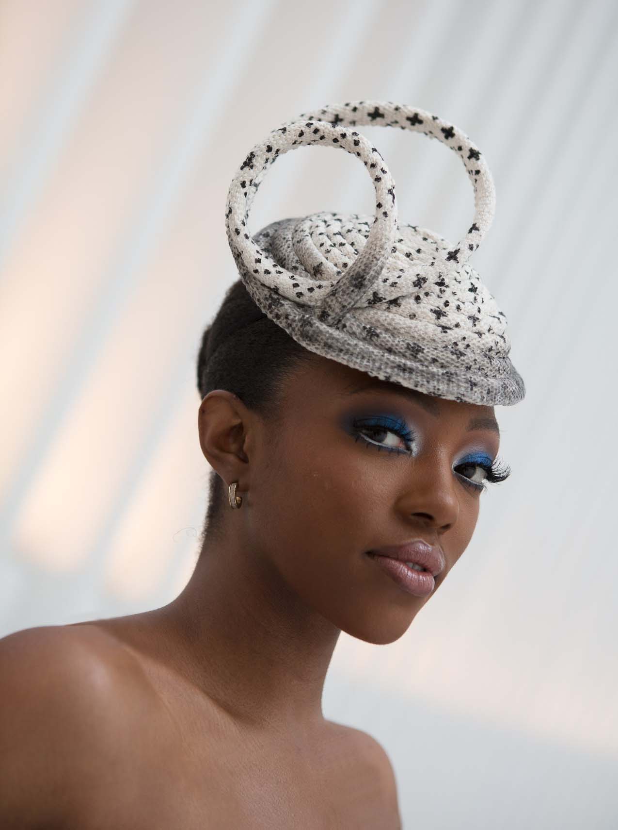 Wire Sculpted Swirl Fascinator. Gradient Edge Finish and Moveable Loops. Satin Lined Base with Elastic Headband. Hand Crafted in Bronx, NY.