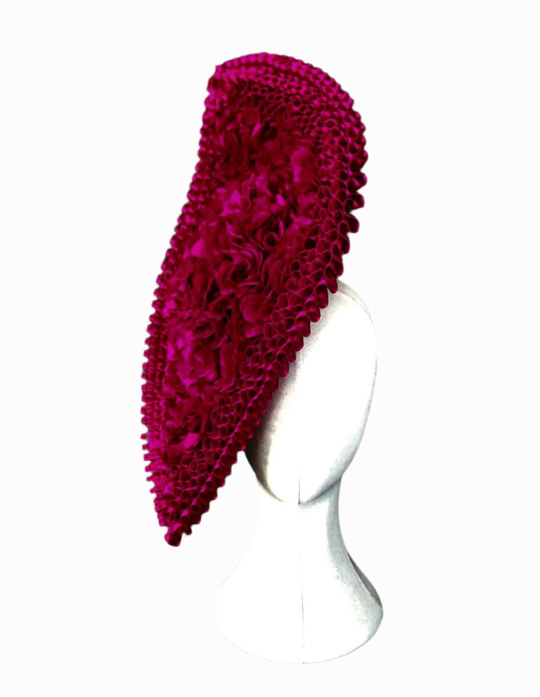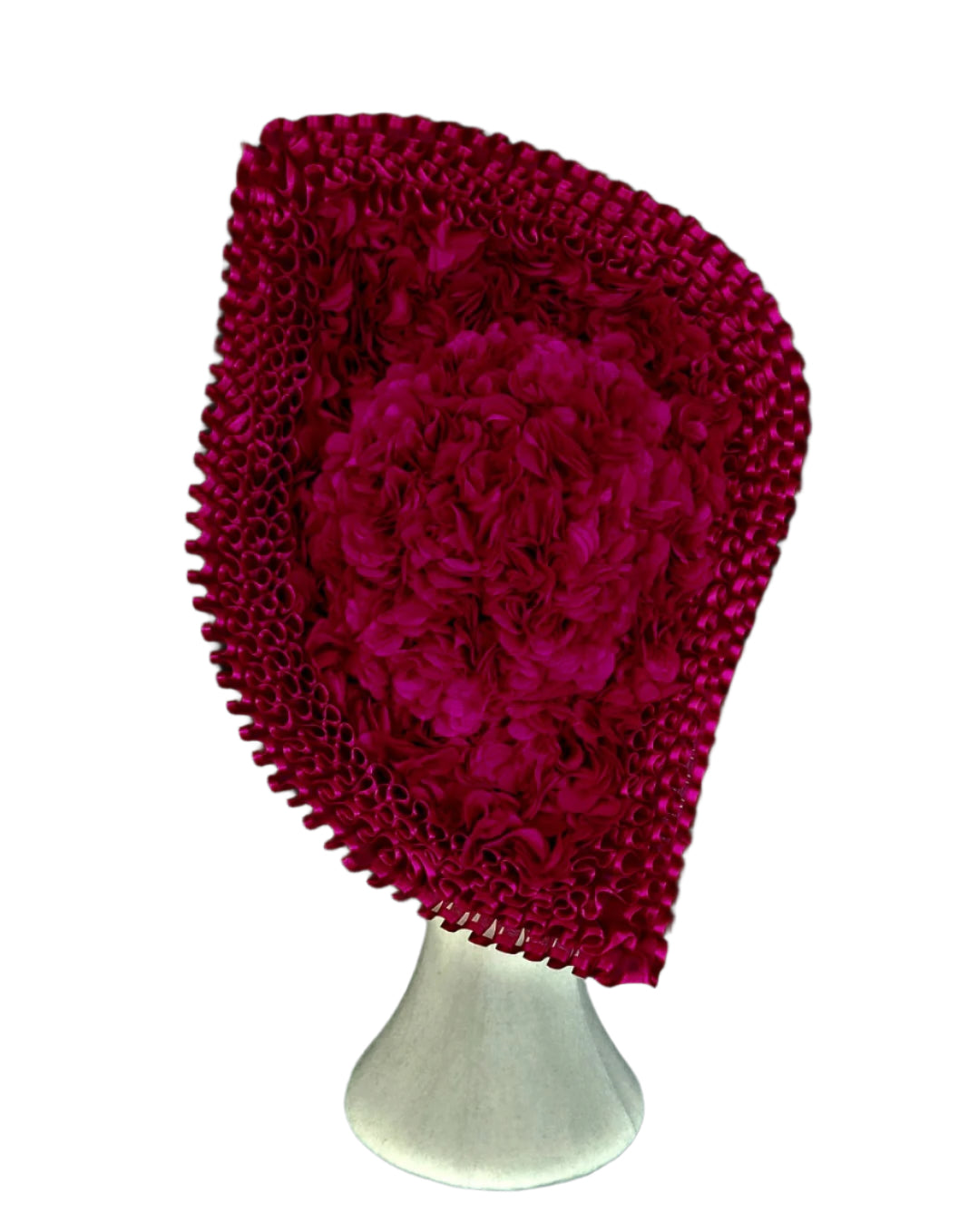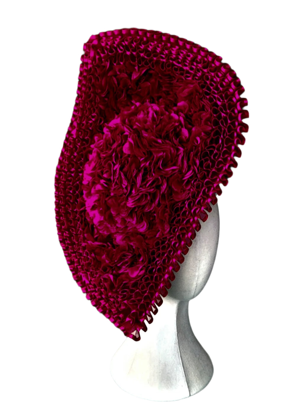 Peek-a-boo Wine-Bordeaux Ruffle and Petal Fascinator on a Sinamay Base and Headband. Hand Crafted in Bronx, NY.