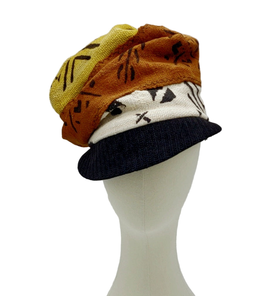 White, Brown and Mustard Lined Medium Weight Cotton Mud Cloth Hat, Spring/Fall/Winter. Classic CRUSH Crown Height. Satiny Lining, Elasticized back, Sweatband *Large sizes available. Made in NYC.