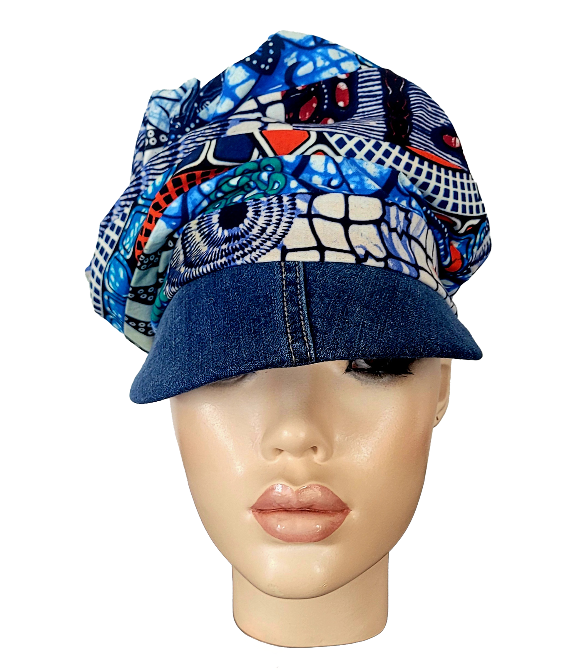 Blue and Red Shell African Print Sustainable Lined M5 Patchwork CRUSH Hat. 100% Cotton Oversized Tall Crushable Crown and Soft Up-cycled Denim brim, Sweatband, Encased Elastic Back for Comfort and Great Fit. Satiny Lining, Removable fleece.,*Large sizes available. Made in NYC.