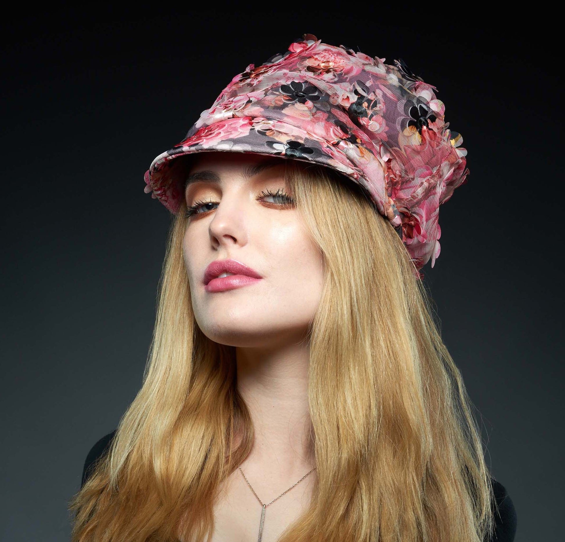 Pink & Black Sheer, Floral Appliqued, Oversized Tall Lined CRUSH hat with Encased Elastic Back for Comfort and Great Fit. Roomy, Extra Tall and Wide Crown, this lovely is made with Removable Filler for a more relaxed look. *Large sizes available. Made in NYC.