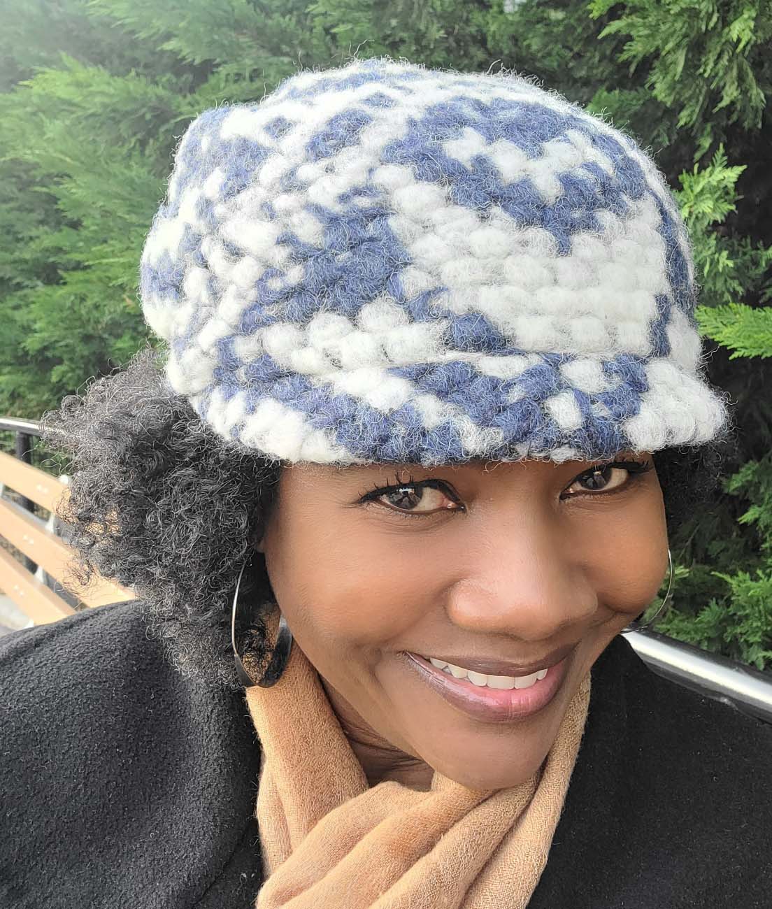 Lined Blue & White Geo Italian Wool Knit Hat, Fall/Winter. Beanie Crown Height, Soft Stingy Brim, Elasticized back, Sweatband, Satiny Lining. *Large sizes available.
