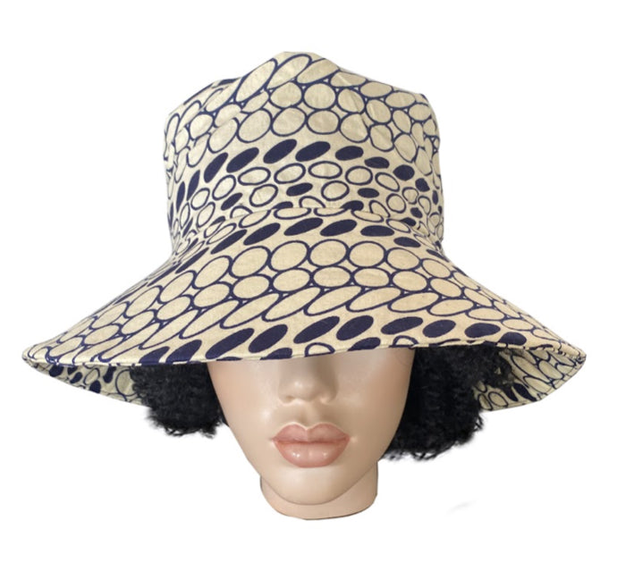 Blue and White African Stones Print, Lined Crushable Crown 100% Cotton Sun Hat, Asymmetric 4” Brim. Easy Packable and great for Travel and Sun shade, Adjustable Fit Sweatband. Made in NYC.