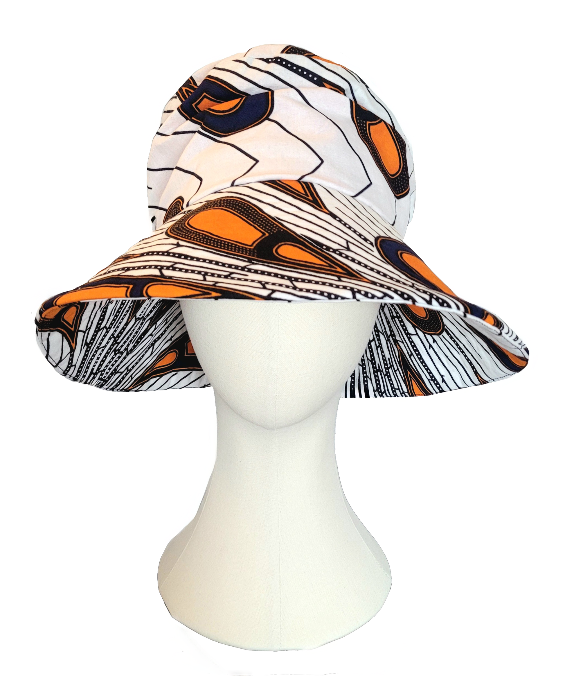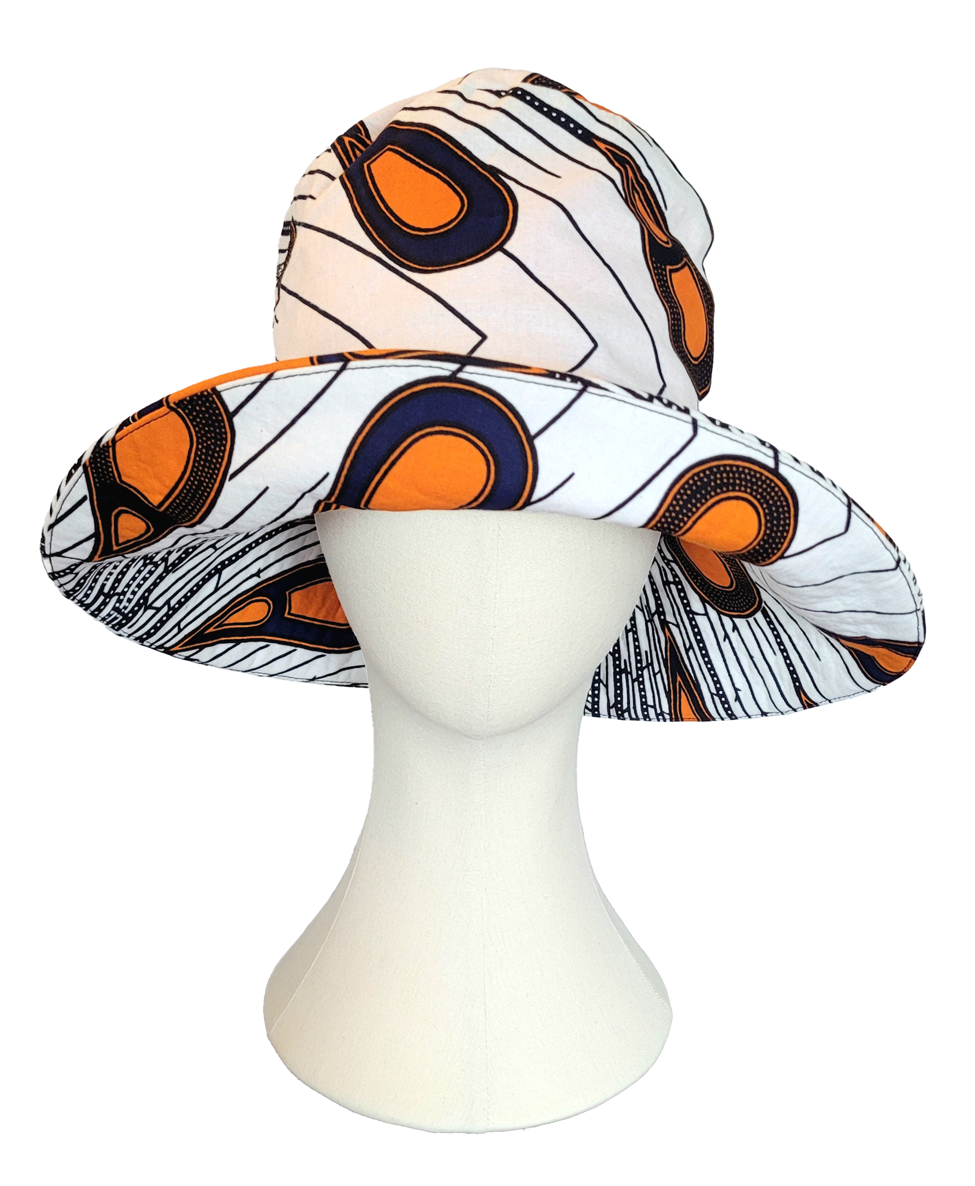 Orange Drops African Print, Lined Crushable Crown 100% Cotton Sun Hat, Asymmetric 4” Brim. Easy Packable and great for Travel and Sun shade, Adjustable Fit Sweatband. Made in NYC.