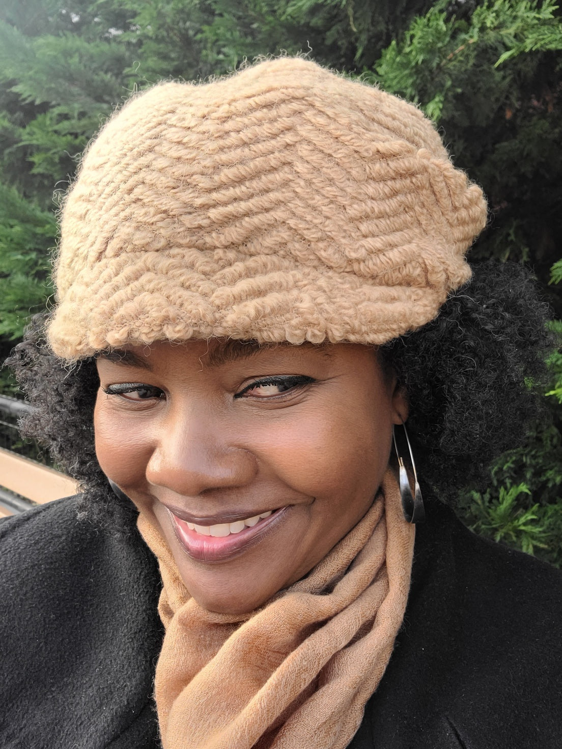 Lined Camel Chunky Italian Wool Knit Hat, Fall/Winter. Beanie Crown Height, Soft Stingy Brim, Elasticized back, Sweatband. Satiny Lining. *Large sizes available. Made in NC.